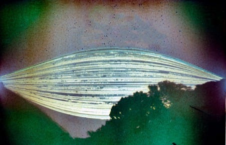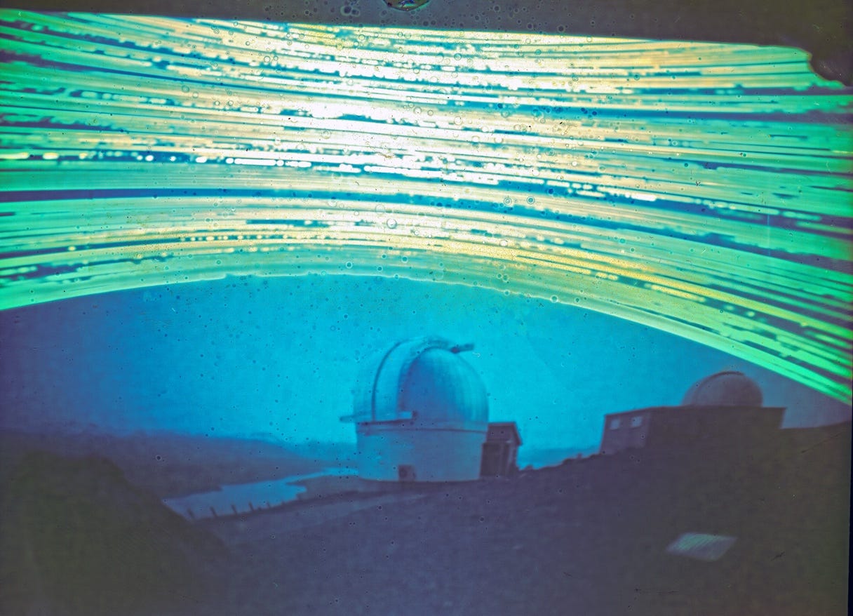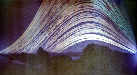 This image is in fact a solargraph. The pinhole camera’s curved focal plane contained photosensitive photographic paper which was chemically darkened by sunlight during the long exposure. This formed a negative image which was scanned on a digital scanner.
