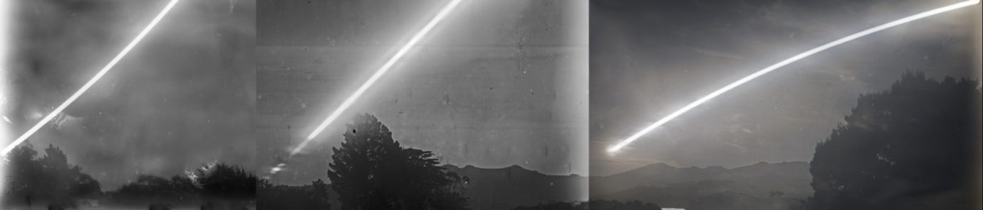 I mounted an Ilford Obscura f/248 pinhole camera facing West. Inside the camera was a single ISO 2 rated 4x5 inch glass plate coated with light-sensitive silver halide emulsion. Beginning on 23rd September 2021, at 4pm precisely (5pm when summertime began), if the sun was visible in the sky, I opened the shutter for 20 seconds. At the winter solstice and autumn equinox, I opened the shutter for longer to record the apparent motion of the sun across the sky.