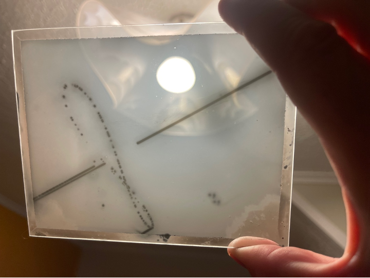 My project ended on 23rd September 2022. I dismounted the camera and took it to a makeshift darkroom in the laundry. Under red light, I removed the plate popping it into a chemical bath to develop the latent image. After a few minutes, I shouted with delight. My yearlong project to capture the solar analemma was successful!